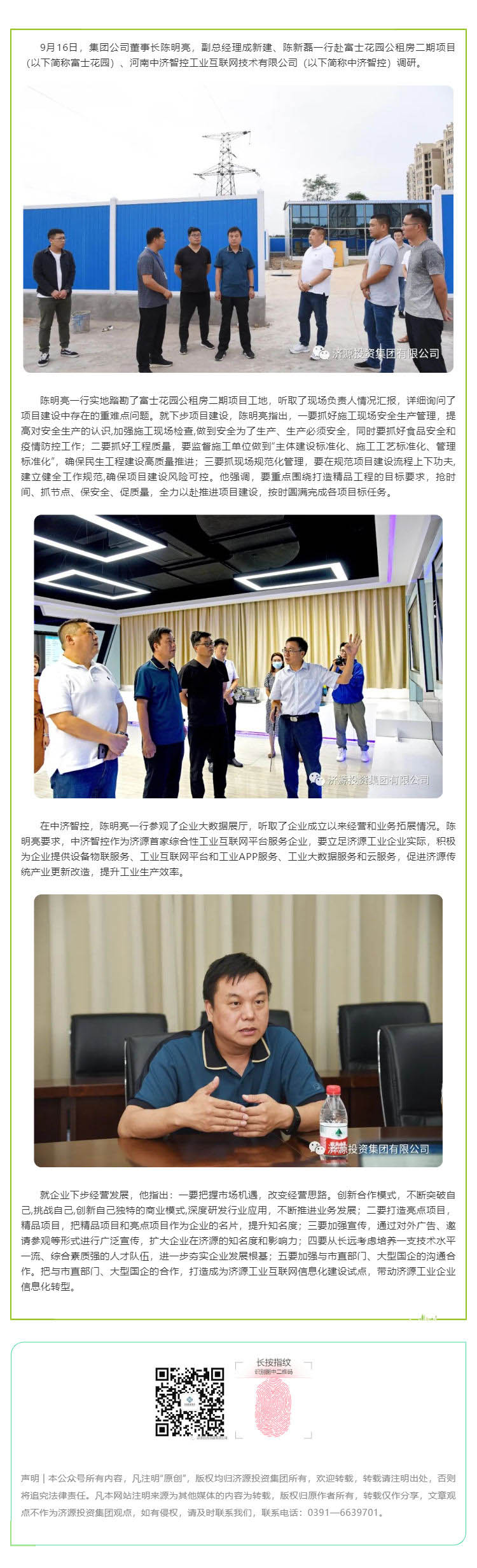 9月16日,濟(jì)源投資集團(tuán)董事長陳明亮,副總經(jīng)理成新建、陳新磊一行赴富士花園公租房二期項(xiàng)目(以下簡稱富士花園)、河南中濟(jì)智控工業(yè)互聯(lián)網(wǎng)技術(shù)有限公司(以下簡稱中濟(jì)智控)調(diào)研。