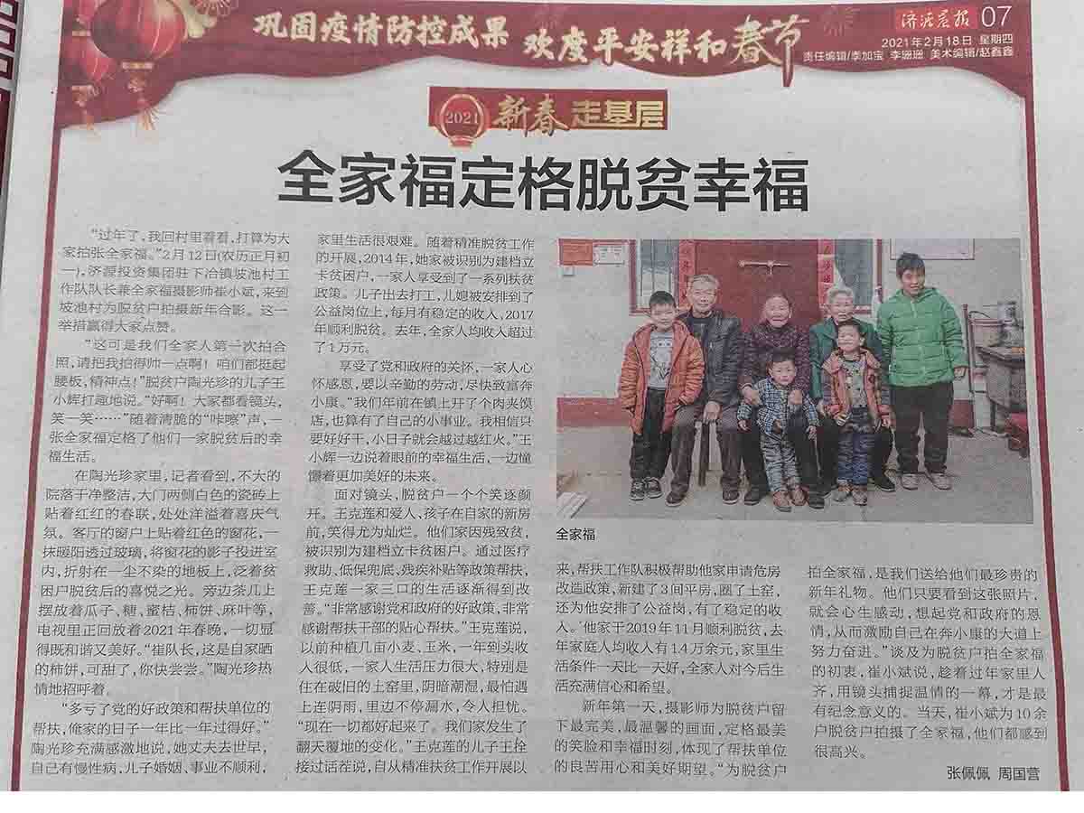 “過年了,我回村里看看,打算為大家拍張全家福?!?月12日(農(nóng)歷正月初一),濟(jì)源投資集團(tuán)駐下冶鎮(zhèn)坡池村工作隊(duì)隊(duì)長兼全家福攝影師崔小斌,來到坡池村為脫貧戶拍攝新年合影。這一舉措贏得大家點(diǎn)贊。