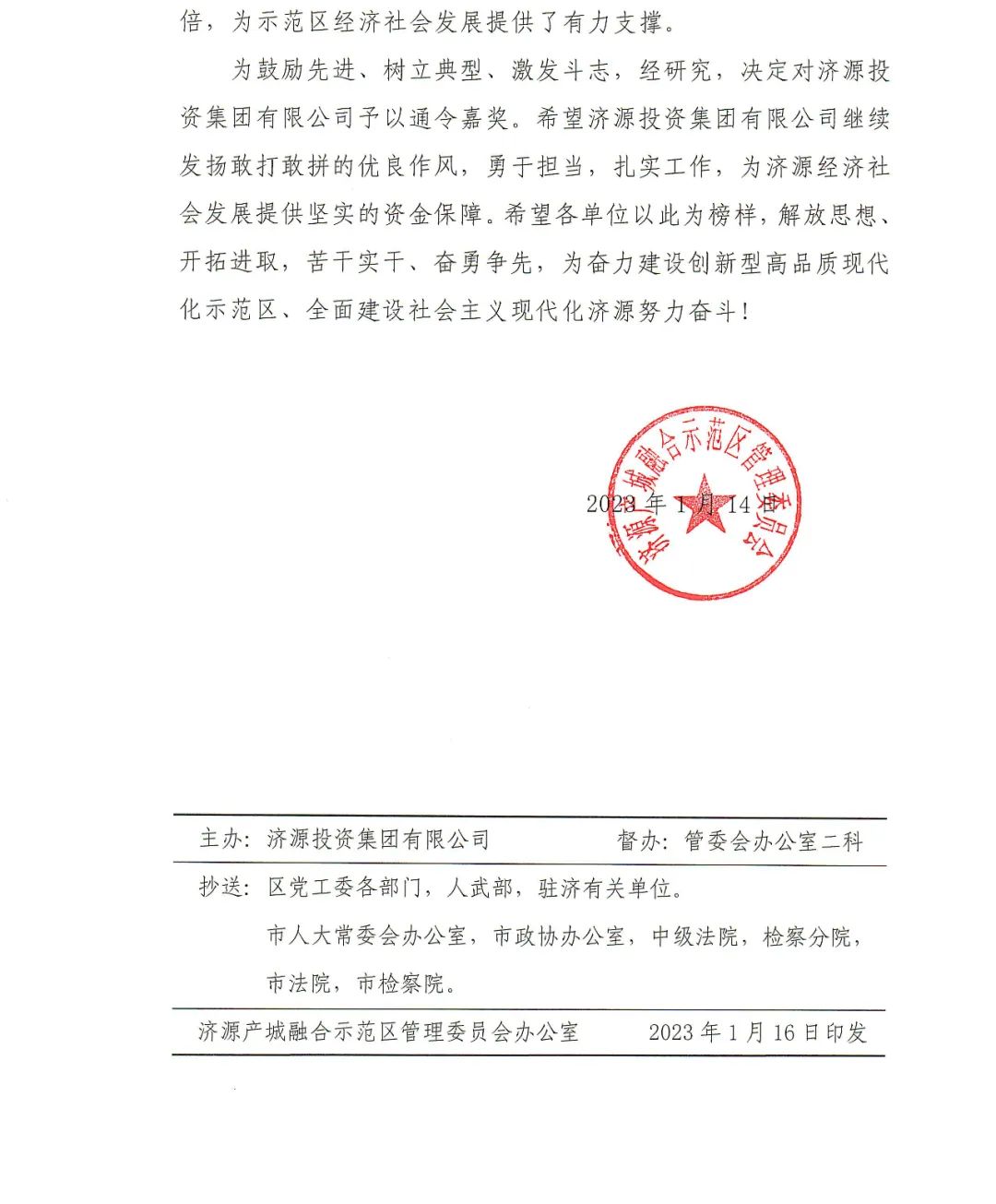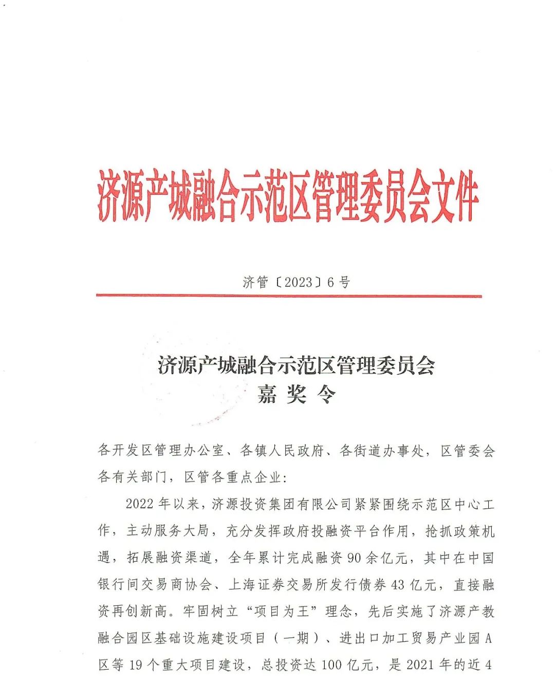 各開發(fā)區(qū)管理辦公室、各鎮(zhèn)人民政府、各街道辦事處、區(qū)管委會各有關(guān)部門、區(qū)管各重點企業(yè):2022年以來,濟源投資集團有限公司緊緊圍繞示范區(qū)中心工作,主動服務大局,充分發(fā)揮政府投融資平臺作用,搶抓政策機遇,拓展融資渠道,全年累計完成融資90余億元,其中在中國銀行間交易商協(xié)會、上海證券交易所發(fā)行債券43億元,直接融資再創(chuàng)新高。牢固樹立“項目為王”理念,先后實施了濟源產(chǎn)教融合園區(qū)基礎(chǔ)設(shè)施建設(shè)項目(一期)、進出口加工貿(mào)易產(chǎn)業(yè)園A區(qū)等19個重大項目建設(shè),總投資達100億元,是2021年的近4倍,為示范區(qū)經(jīng)濟社會發(fā)展提供了有力支撐。? ??為鼓勵先進、樹立典型、激發(fā)斗志,經(jīng)研究,決定對濟源投資集團有限公司予以通令嘉獎。希望濟源投資集團有限公司繼續(xù)發(fā)揚敢打敢拼的優(yōu)良作風,勇于擔當,扎實工作,為濟源經(jīng)濟社會發(fā)展提供堅實的資金保障。希望各單位以此為榜樣,解放思想,開拓進取,苦干實干,奮勇爭先,為奮力建設(shè)創(chuàng)新型高品質(zhì)現(xiàn)代化示范區(qū),全面建設(shè)社會主義現(xiàn)代化濟源努力奮斗!