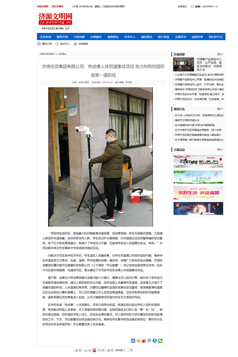 濟(jì)源文明網(wǎng):濟(jì)源投資集團(tuán)有限公司:熱成像人體測溫集成項(xiàng)目 助力構(gòu)筑校園防疫第一道防線