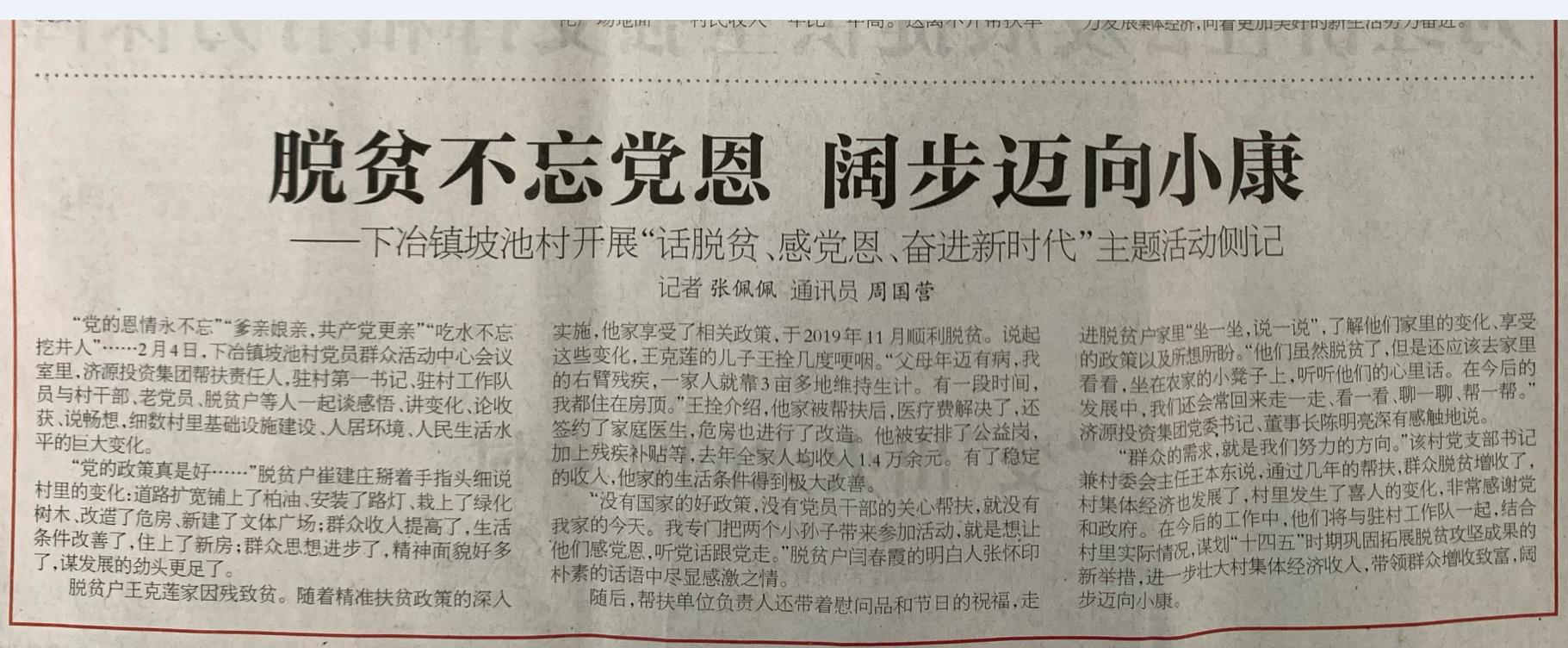 “黨的恩情永不忘”“爹親娘親,共產(chǎn)黨更親”“吃水不忘挖井人”……2月4日,下冶鎮(zhèn)坡池村黨員群眾活動(dòng)中心會(huì)議室里,濟(jì)源投資集團(tuán)幫扶責(zé)任人,駐村第一書記、駐村工作隊(duì)員與村干部、老黨員、脫貧戶等人一起談感悟、講變化、論收獲、說(shuō)暢想,細(xì)數(shù)村里基礎(chǔ)設(shè)施建設(shè)、人居環(huán)境、人民生活水平的巨大變化。