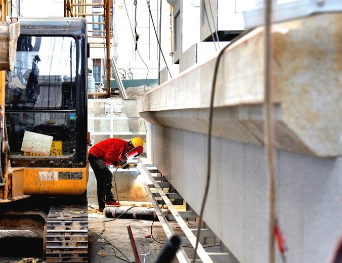 “這是當(dāng)前最主要的施工環(huán)節(jié),我們安排了130余名工人。”項(xiàng)目技術(shù)負(fù)責(zé)人楊超委說,10層以下的外墻已完成全部施工,當(dāng)前難度最大的工作就是主樓正前方兩根羅馬柱的干掛。