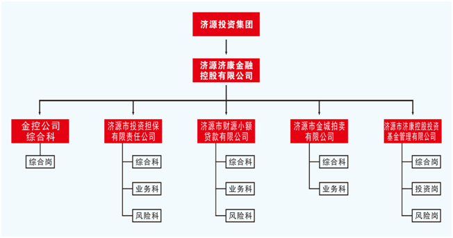 金控公司目前所轄四個(gè)公司,分別為:濟(jì)源市投資擔(dān)保有限公司、濟(jì)源市財(cái)源小額貸款有限公司、濟(jì)源市金城拍賣有限公司、濟(jì)源市濟(jì)康控股投資基金管理有限公司。